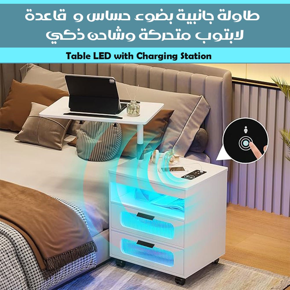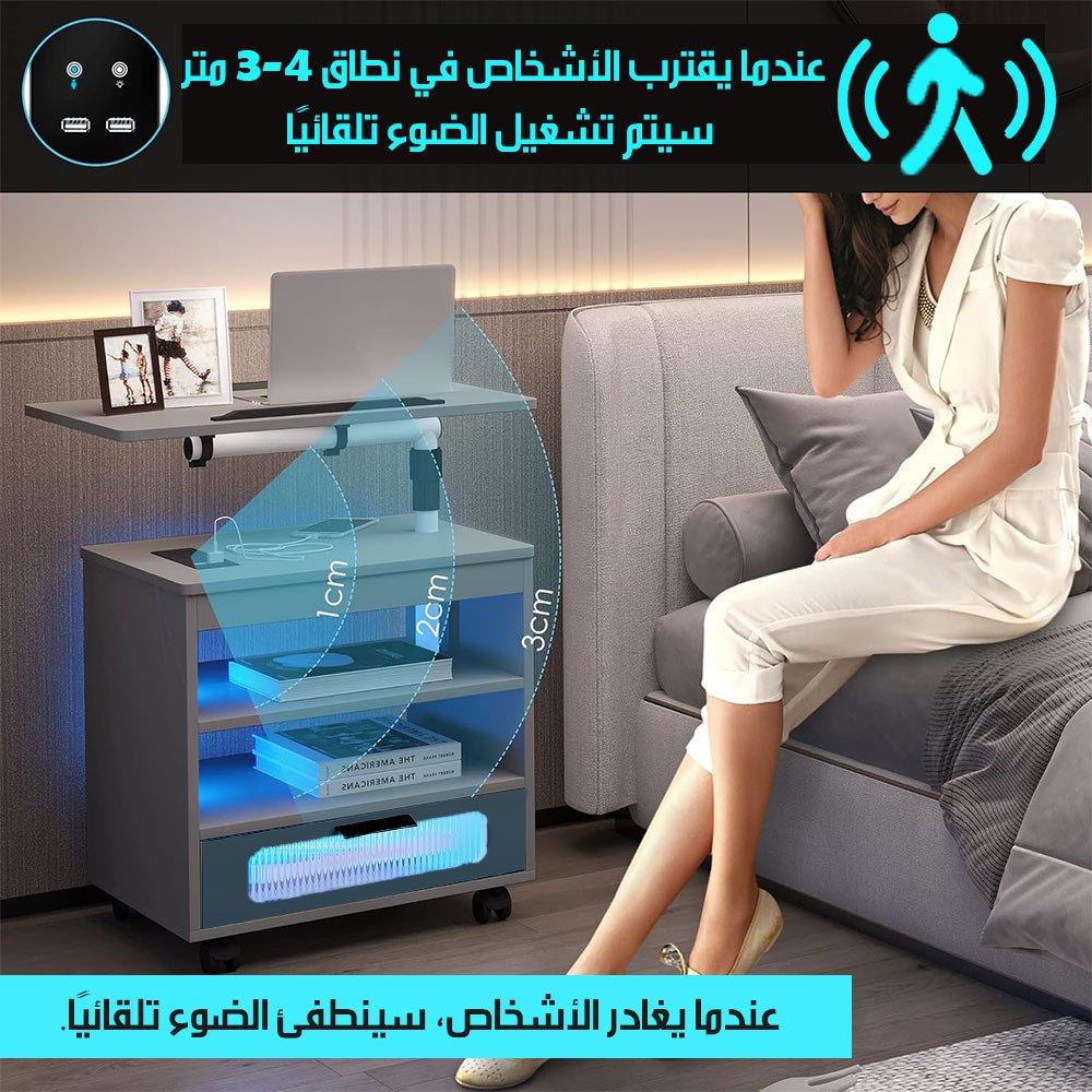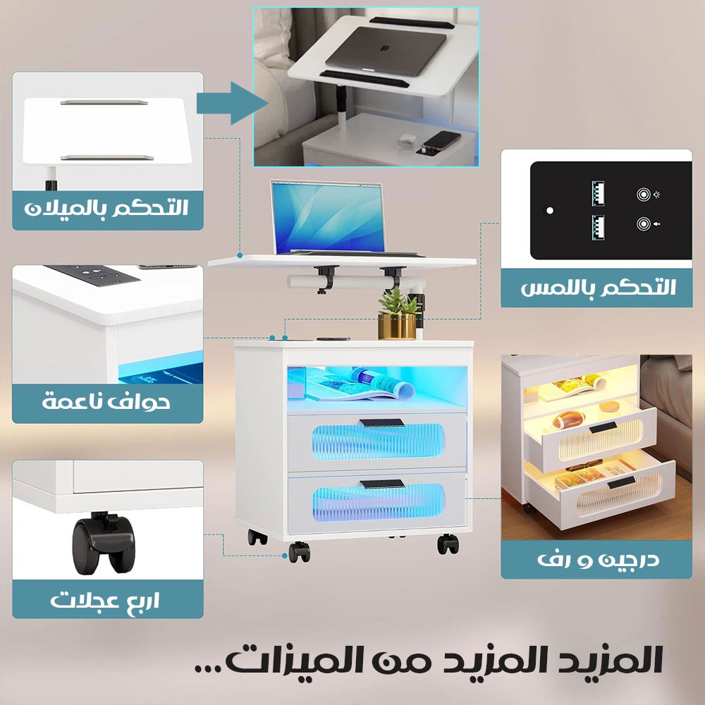 طاولة جانبية بضوء حساس وقاعدة لابتوب متحركة وشاحن ذكي