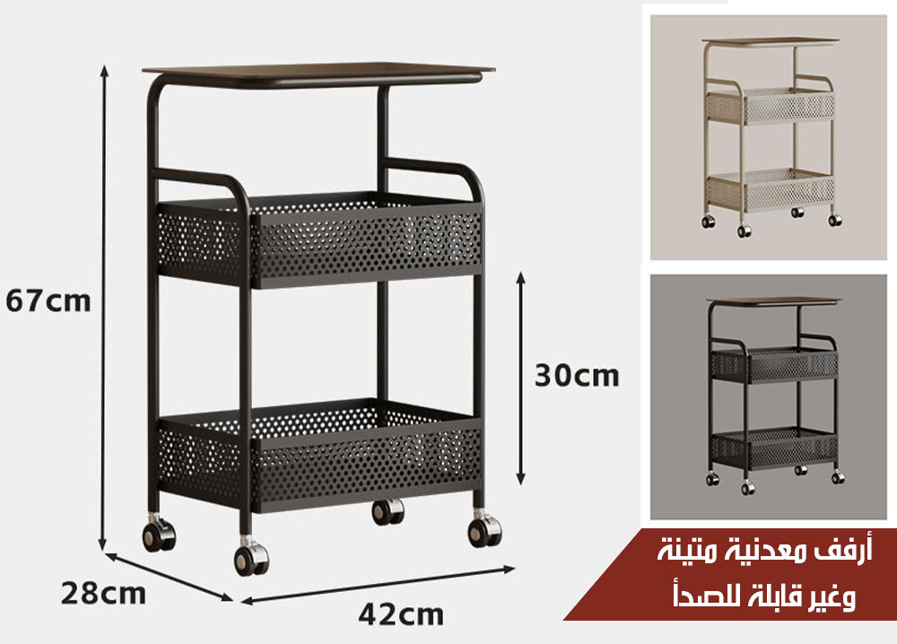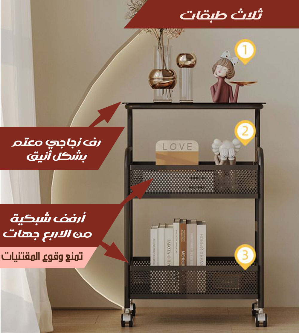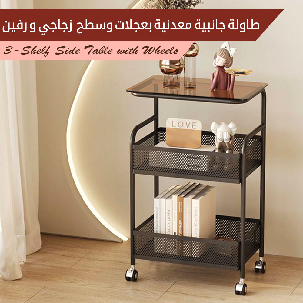 طاولة جانبية معدنية بعجلات وسطح زجاجي و رفين 3-Shelf Side Table With Wheels